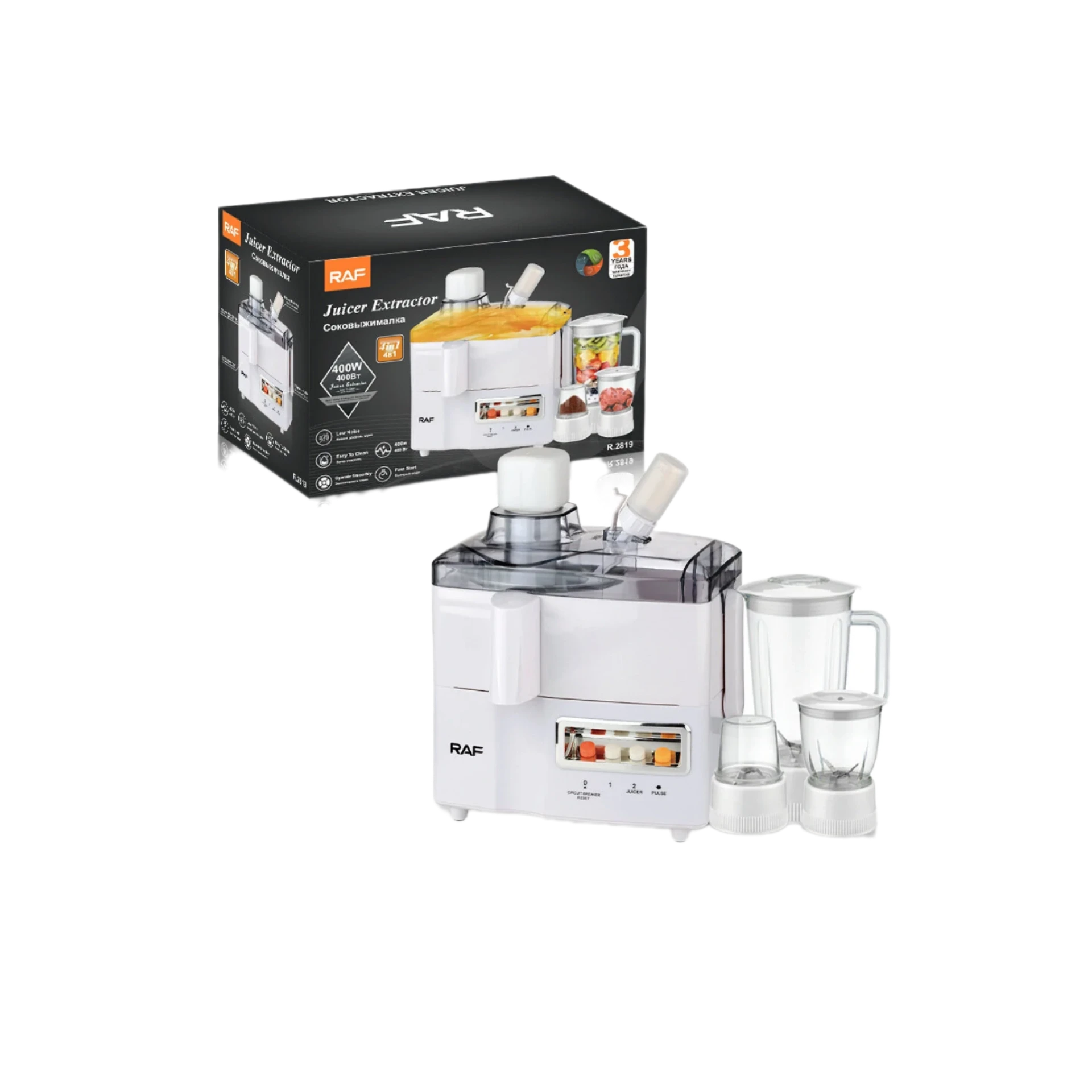 • محرك بقوة 400 واط يقدّم أداء ممتاز لاستخلاص العصير والطحن والخفق.