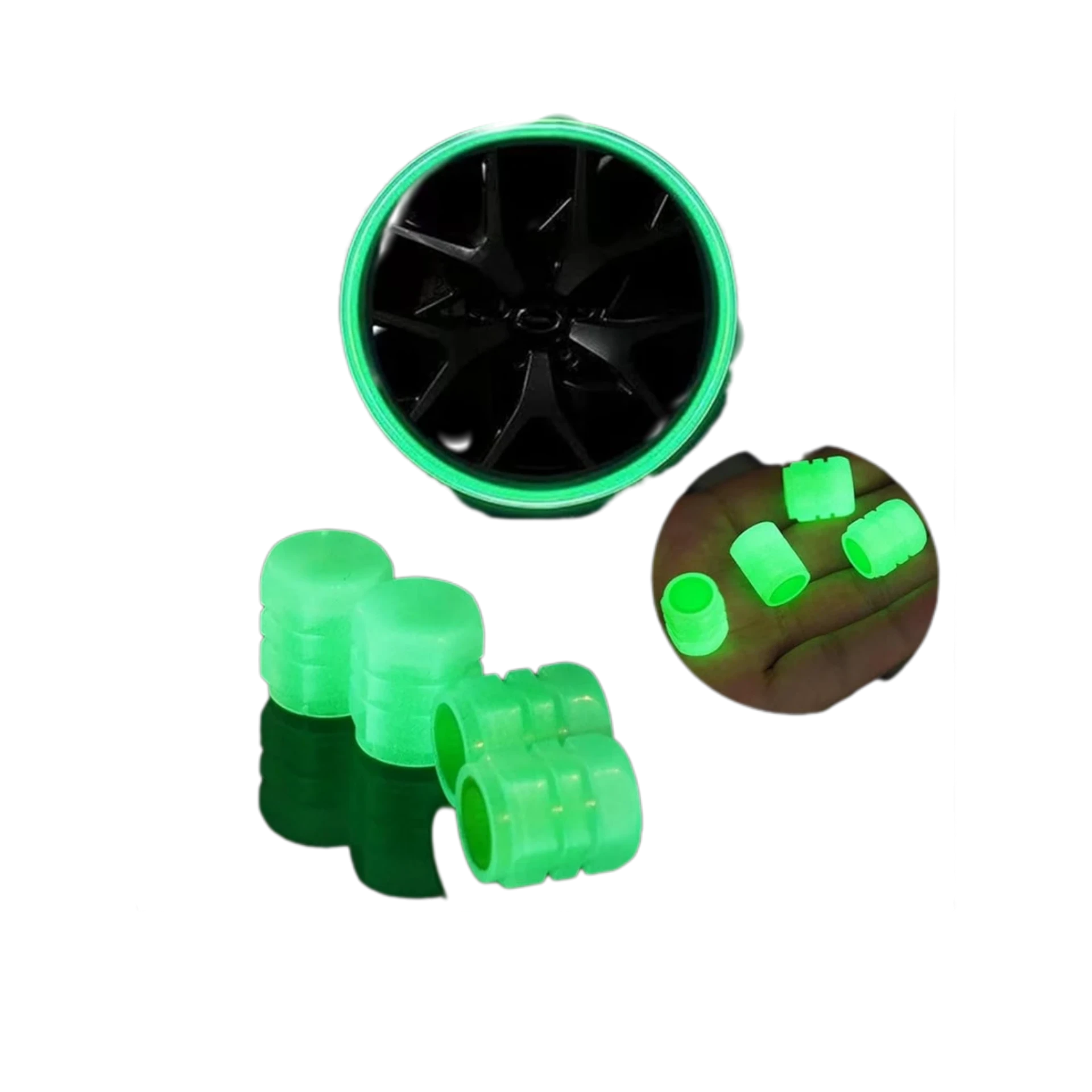 أغطية بلف للكفرات تتوهج في الظلام بدون بطارية أو كهرباء، تعطي شكلاً أنيقًا ومميزًا للعجلات ليلًا. تُركّب بسهولة على كفرات السيارات والدراجات النارية والهوائية، وتزيد من الجاذبية والشكل الرياضي مع تحسين الرؤية الليلية.