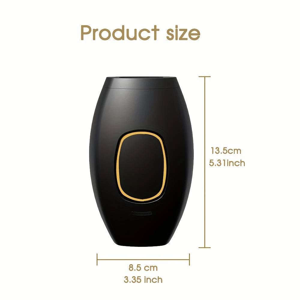 يتميز الجهاز بتصميم انسيابي مريح بلون أسود ملكي مع لمسات ذهبية حول زر التشغيل الرئيسي. يحتوي على نافذة معالجة مدمجة تلامس الجلد مباشرة، وشاشة عرض رقمية مخفية (في بعض الموديلات المماثلة) لمتابعة عدد الومضات المتبقية، مع مستويات طاقة متعددة تناسب حساسية مناطق الجسم المختلفة.