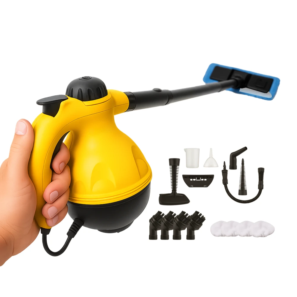 هذا الجهاز عبارة عن منظف بخاري يدوي عالي الضغط، مصمم لتعقيم وتنظيف الأسطح الصعبة بدون الحاجة للمواد الكيميائية. يعمل الجهاز عن طريق تسخين الماء لدرجة الغليان لإنتاج بخار قوي يفتت الدهون، الأوساخ، والعفن من مختلف الزوايا. يأتي بتصميم مريح لليد (Handheld) مع مجموعة واسعة من الملحقات التي تجعله مثالياً للمطابخ، الحمامات، والسيارات.