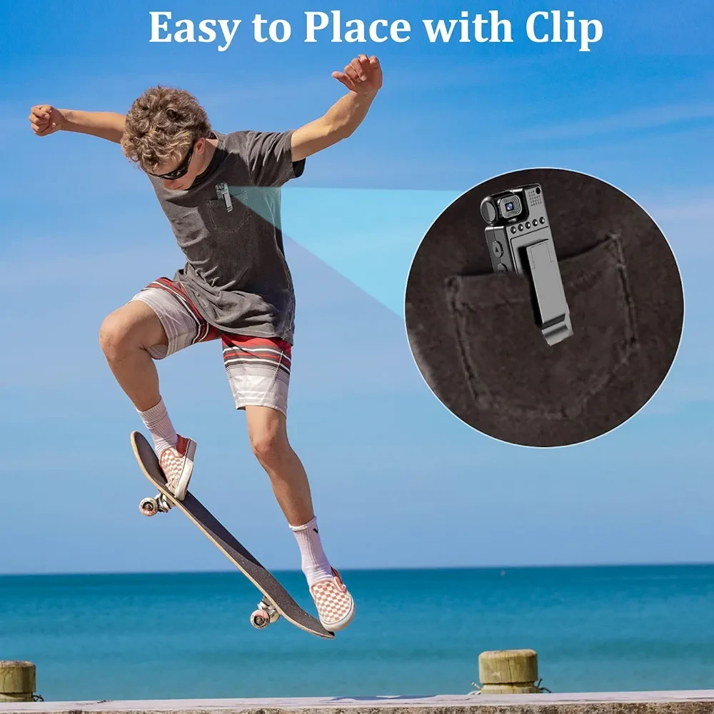 ضبط الزاوية: قم بتدوير عدسة الكاميرا لتناسب وضعية تثبيتها (سواء كانت في جيب القميص أو مثبتة على دراجة).