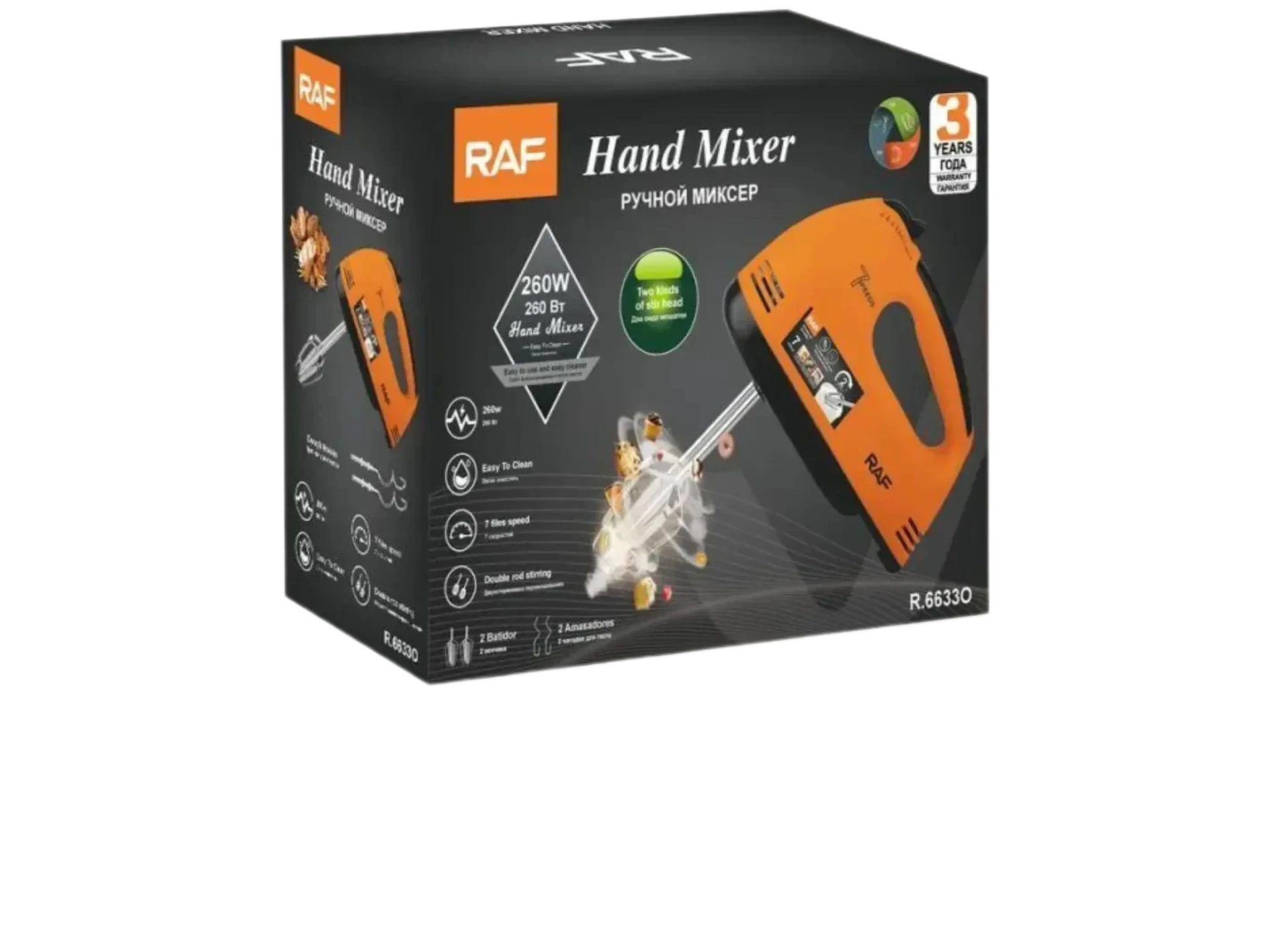 جهاز الخلط اليدوي من شركة RAF هو أداة لا غنى عنها لتحضير الحلويات والمخبوزات. يأتي المحرك بقوة 260 واط ليوفر طاقة كافية للتعامل مع مختلف القوامات، بدءاً من خفق الكريمة الخفيفة وصولاً إلى خلط العجين المتماسك. يتميز بنظام تحكم ذكي يحتوي على 7 مستويات للسرعة، مما يتيح لك الدقة في اختيار القوة المناسبة لكل وصفة. الهيكل الخارجي مصنوع من بلاستيك مقوى عالي الجودة، مع أزرار تحكم سهلة الوصول لفك الملحقات أو تغيير السرعات بضغطة واحدة.