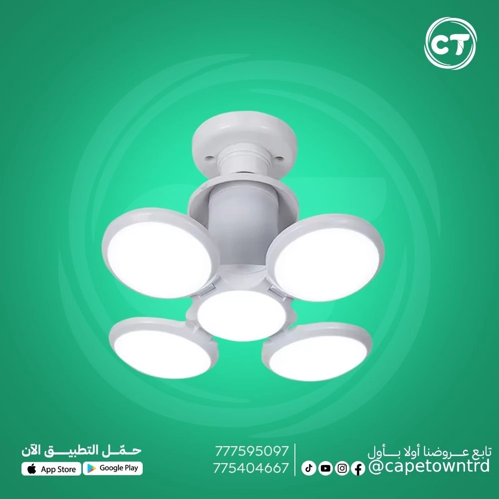 التصميم: إضاءة مركزية مع 4 أذرع (شفرات) LED قابلة للطي والتوجيه حتى 90 درجة.