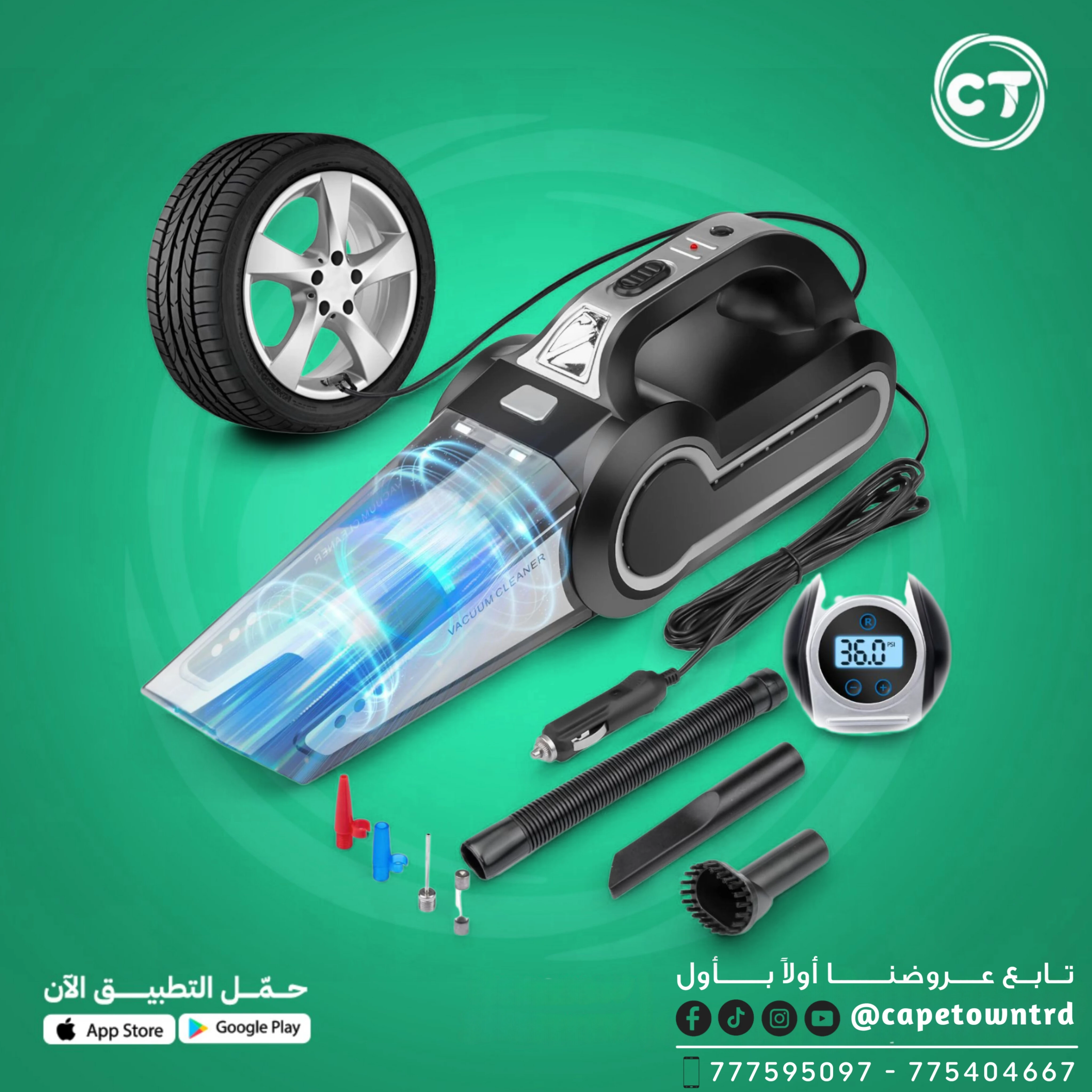 متعددة الوظائف 4 في 1: مكنسة كهربائية + مضخة هواء + مقياس ضغط + كشاف LED للطوارئ.