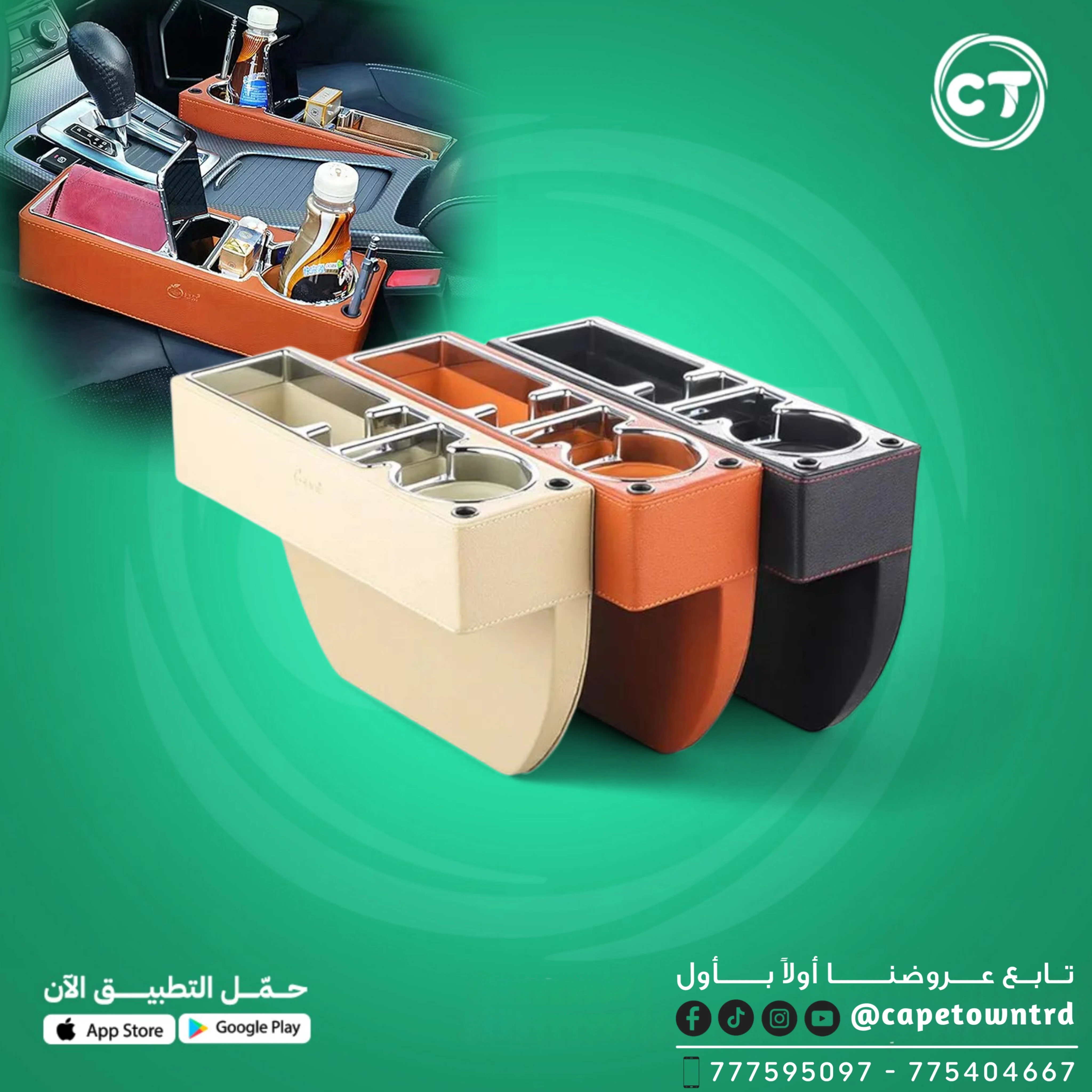 تصميم متعدد الأغراض: مساحات لحفظ الهواتف، المحافظ، المفاتيح، الأقلام، المناديل، وحامل أكواب مدمج