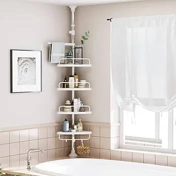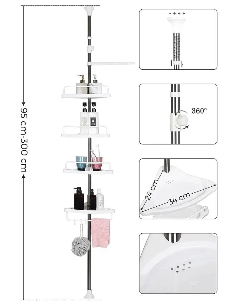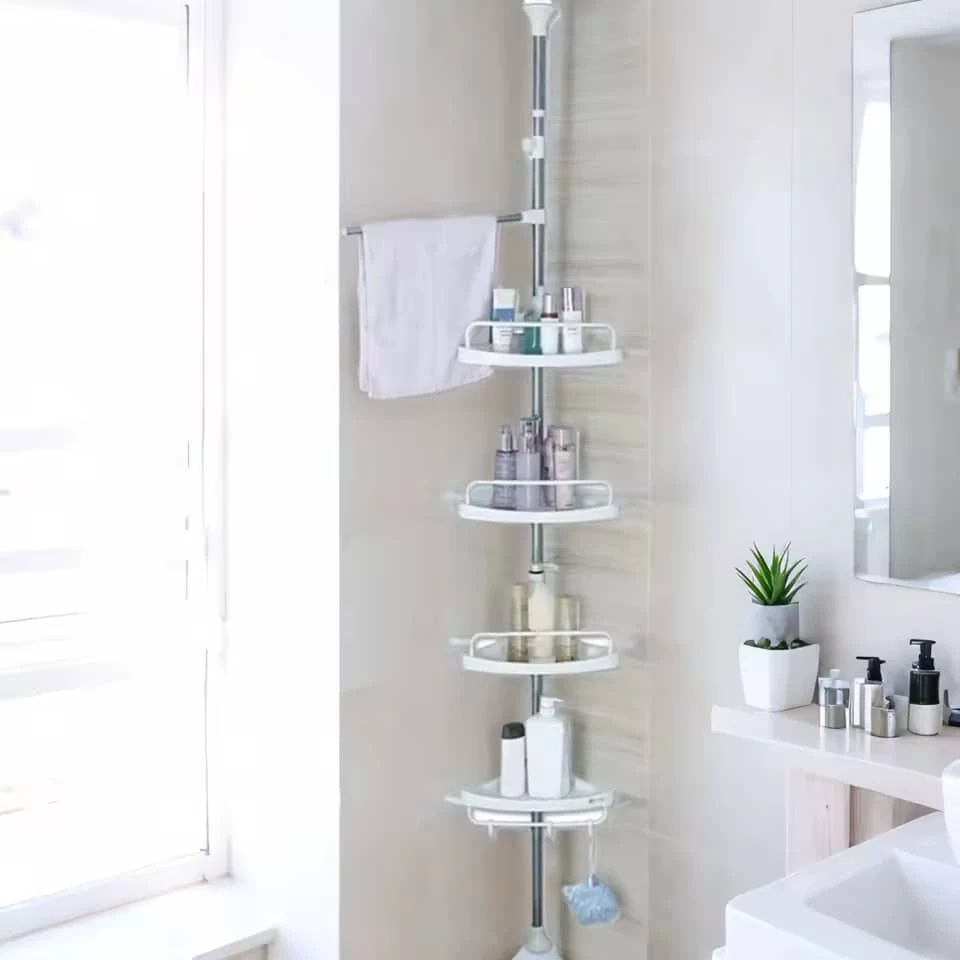 تصميم زاوي موفر للمساحة مع قدرة على حمل شامبو، صابون، علب، أدوات تنظيف وغيرها.