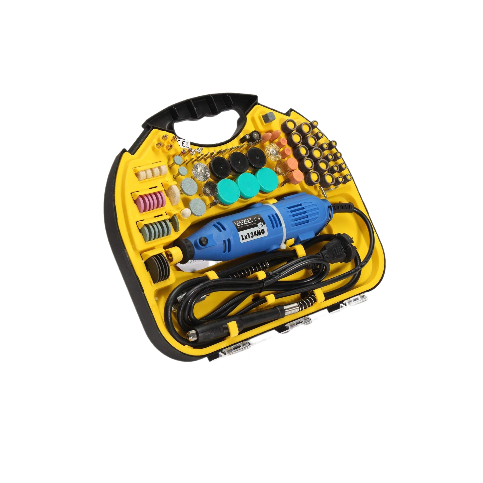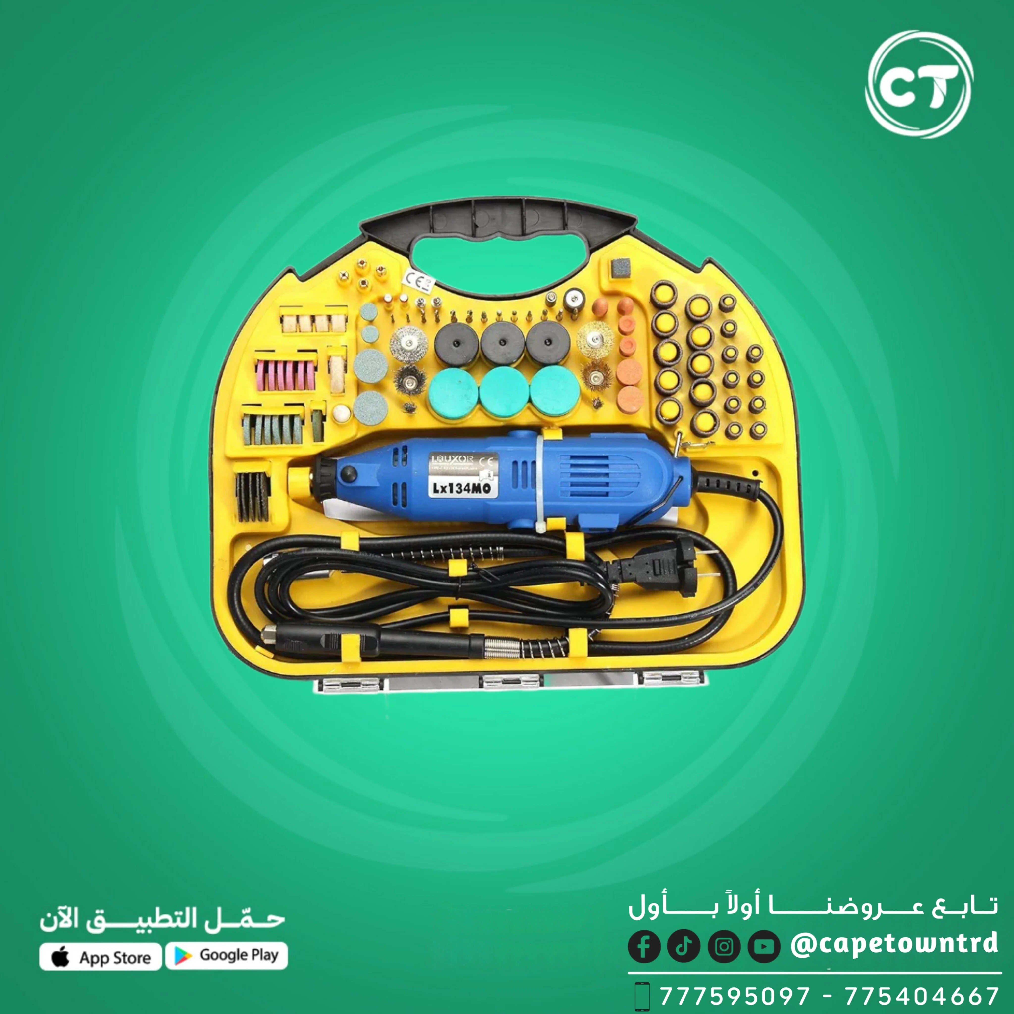 • المكونات: يحتوي على المثقاب الكهربائي الأساسي مع مجموعة كبيرة من الملحقات مثل رؤوس القطع، وأقراص الصنفرة، وأدوات التلميع، ورؤوس الحفر، وأدوات التنظيف.