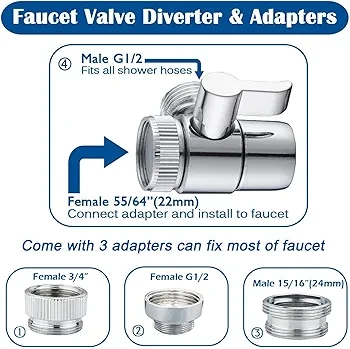 التشغيل: افتح المياه، واستخدم المفتاح الصغير الموجود على المحول للتحويل بين تدفق الماء من "الصنبور لأسفل" أو "الدش للخارج".