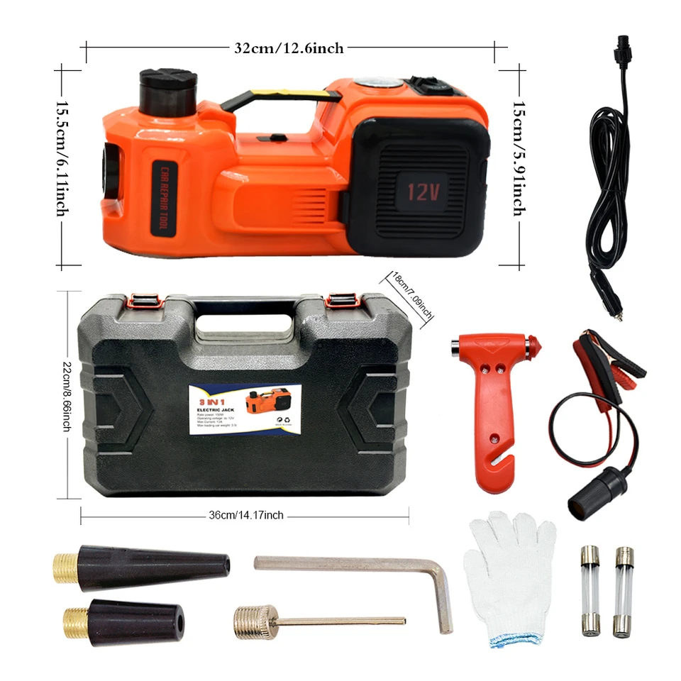 الوظائف المدمجة: (رافعة هيدروليكية، منفاخ إطارات، كشاف LED للإضاءة، ومطرقة طوارئ).