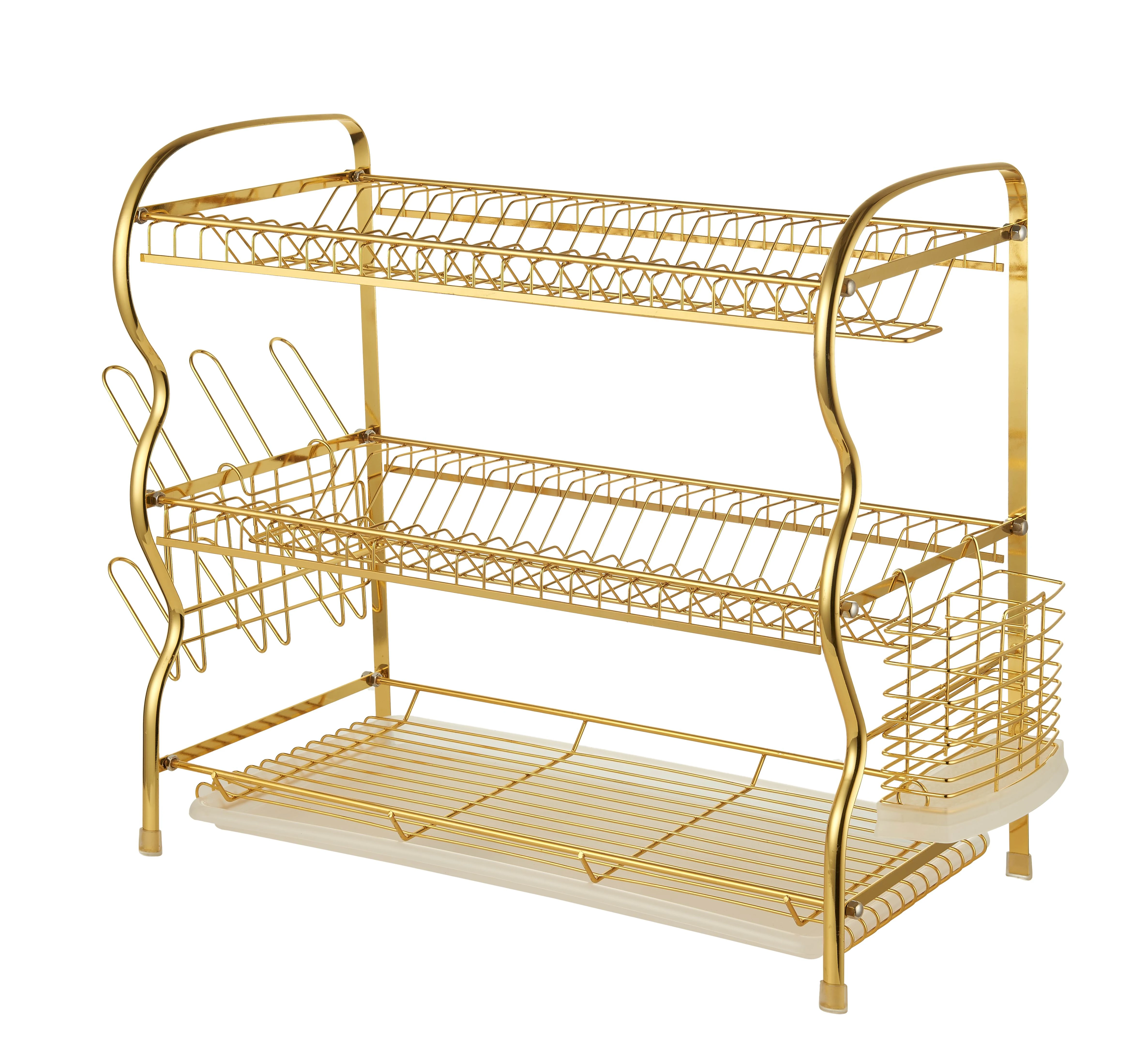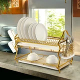 رف صحون مزدوج ذهبي فاخر لتجفيف وتنظيم الأواني