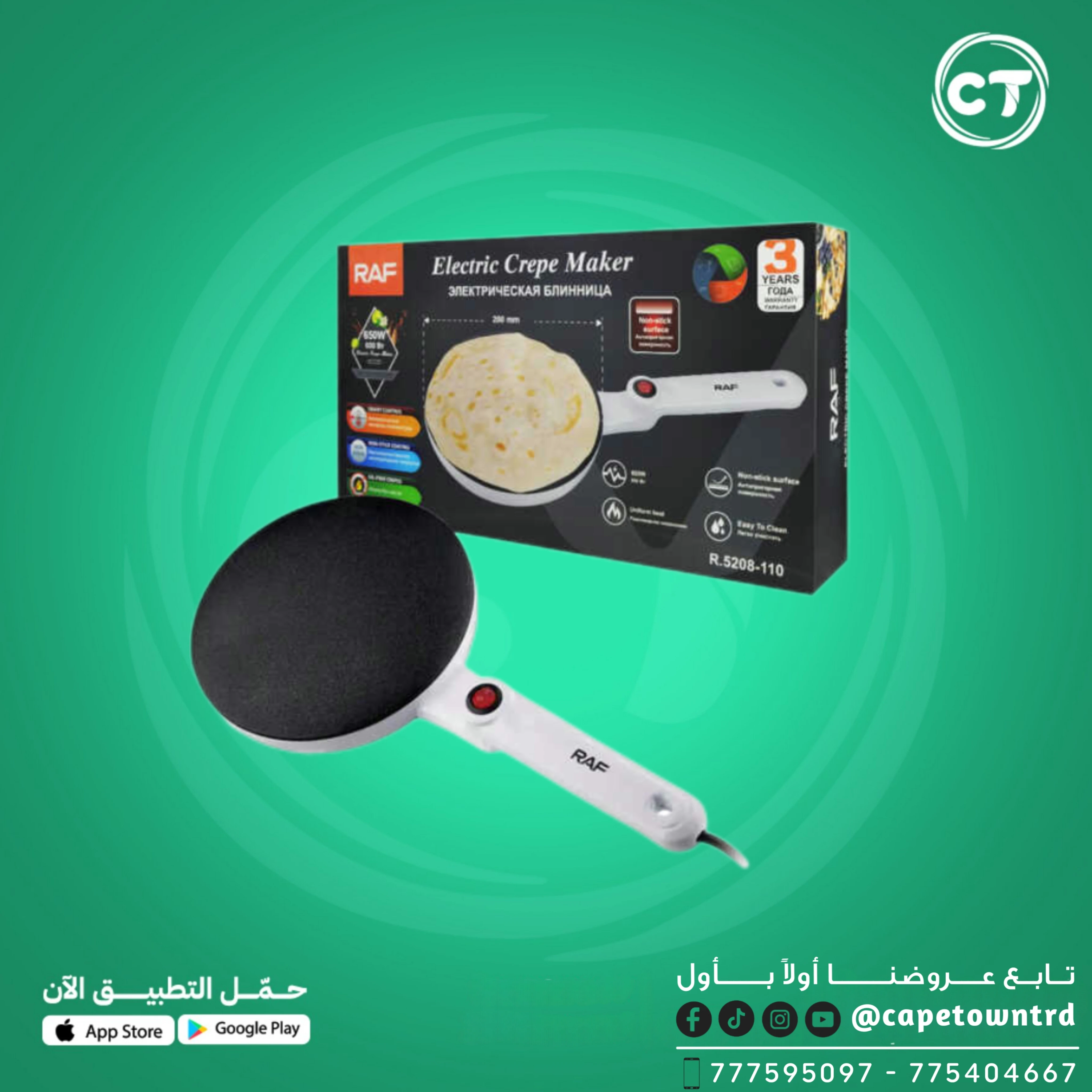 • 🍳 سطح غير لاصق – يمنع التصاق الكريب ويوفر طهي متساوٍ.