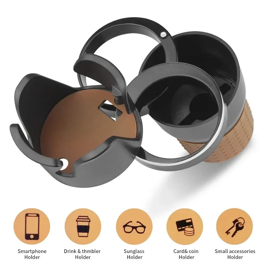 تصميم 5 في 1: حامل أكواب ومشروبات + حامل للهاتف + مكان للنظارات + فتحة للعملات والبطاقات + مساحة للملحقات الصغيرة.