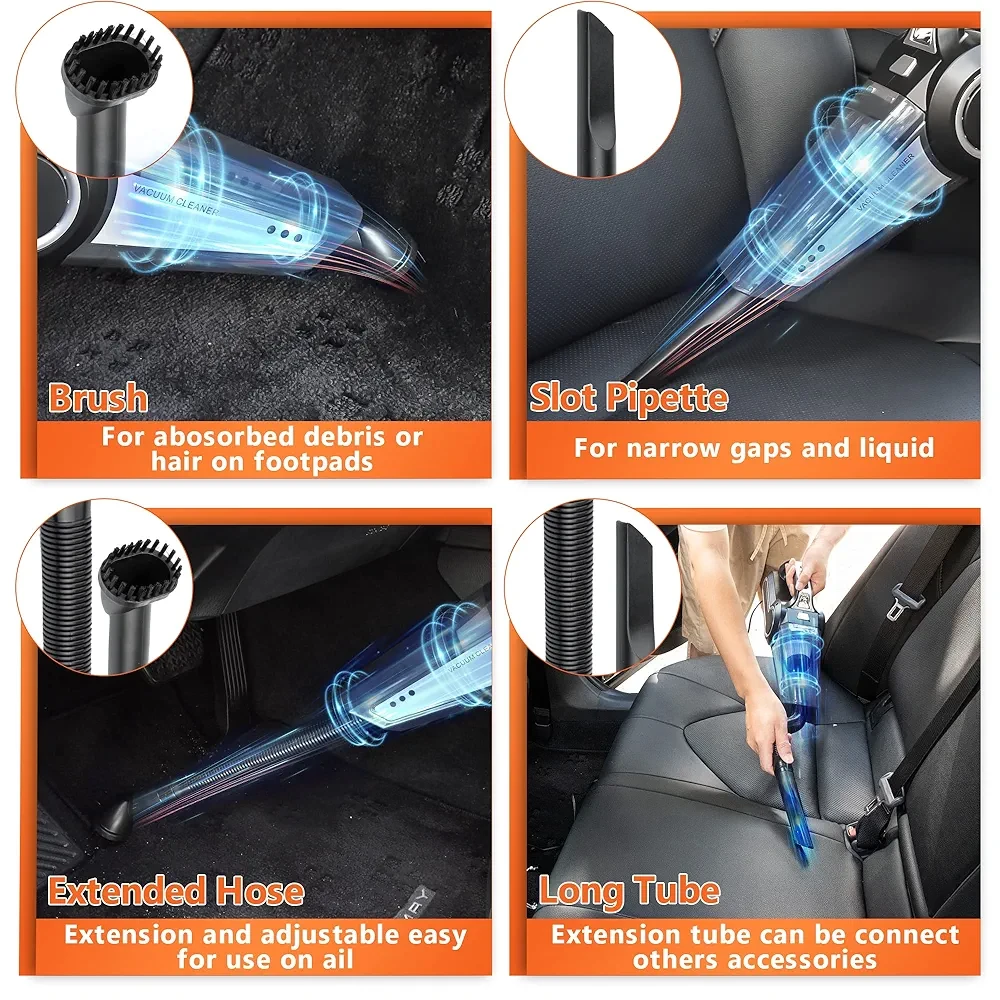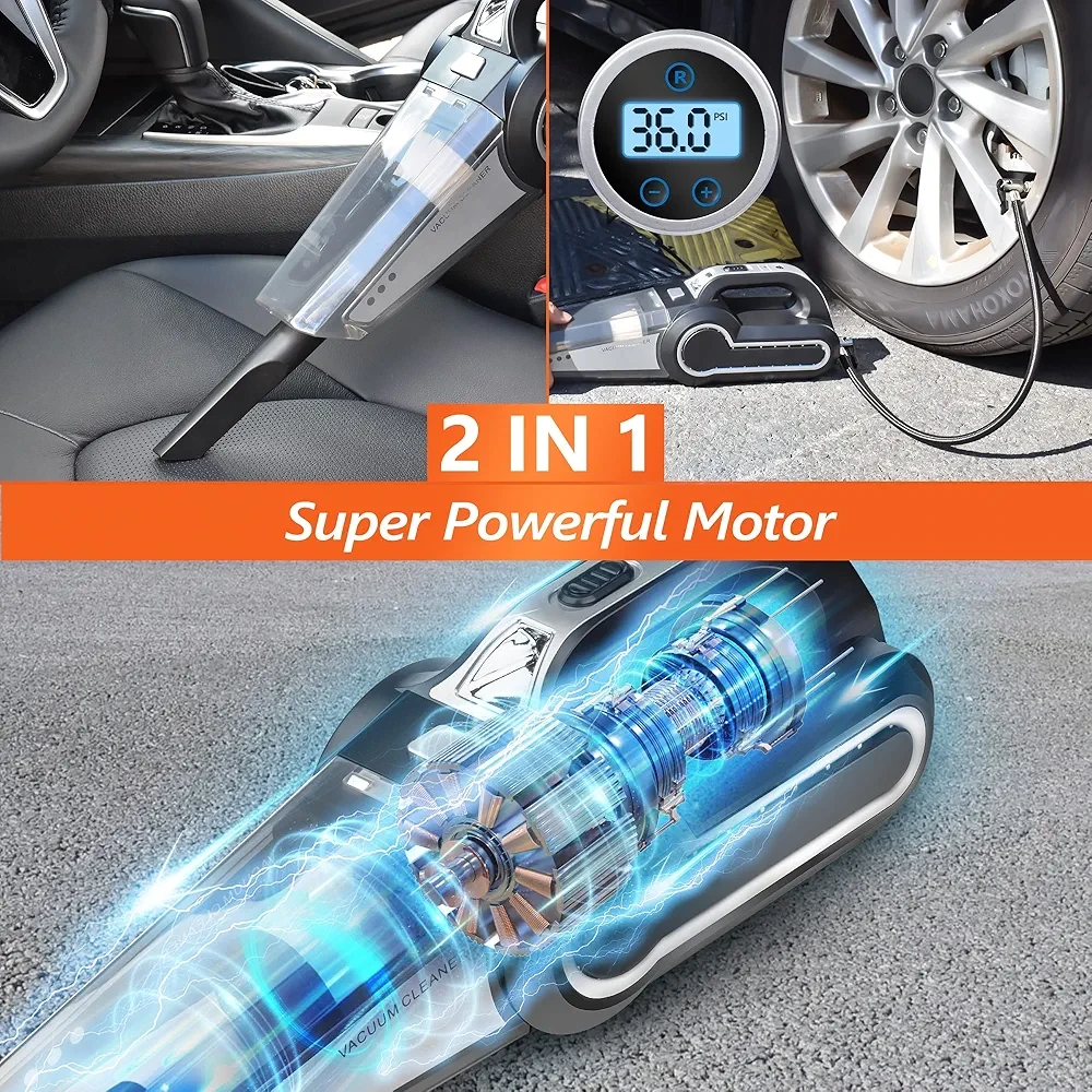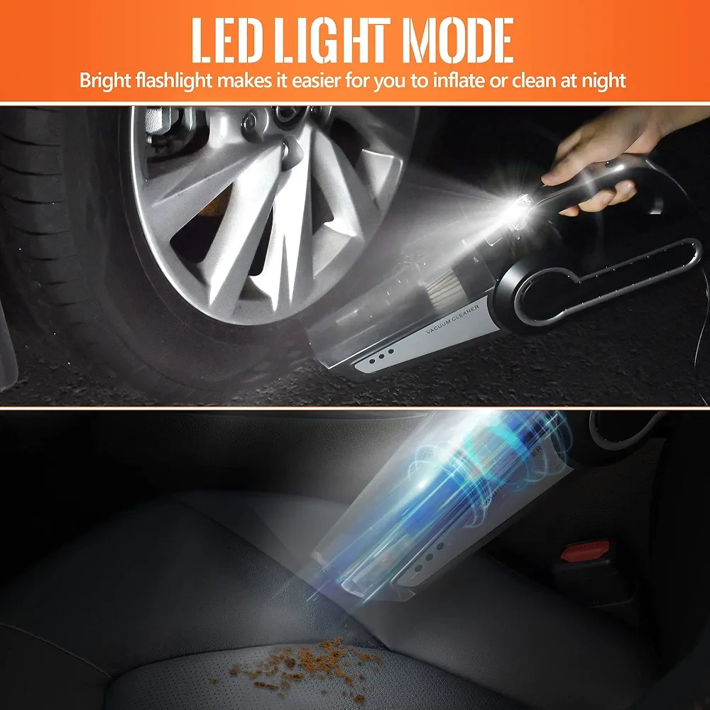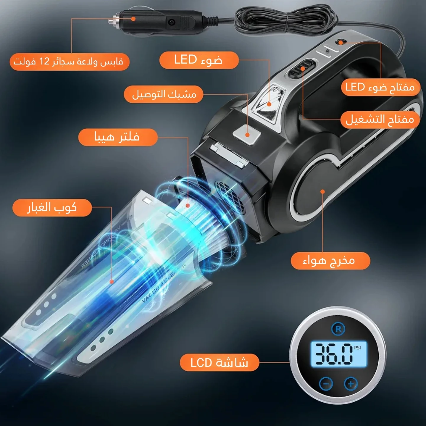 متعددة الوظائف 4 في 1: مكنسة كهربائية + مضخة هواء + مقياس ضغط + كشاف LED للطوارئ.