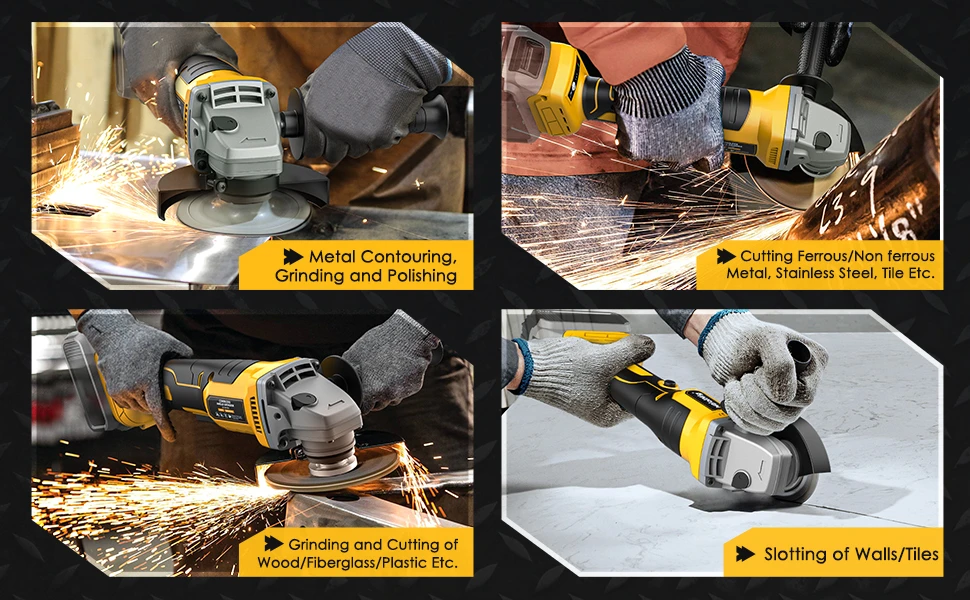 يأتي الجهاز بتصميم مدمج يدمج بين اللونين الأصفر والأسود، مزود بمحرك جبار يدعم أقراص القص بقطر 125mm. يتميز برأس معدني صلب وعمود دوران بمقاس M14، مع مقبض جانبي قابل للتركيب لضمان التحكم والدقة. يعمل ببطارية ليثيوم بسعة 4000mAh، ويحتوي على واقي حماية (Guard) قابل للتعديل لسلامة المستخدم أثناء العمل.