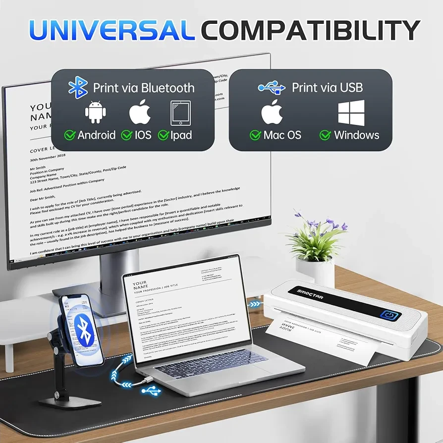 طباعة لاسلكية فورية: اتصال سريع عبر البلوتوث مع الهاتف أو الجهاز اللوحي للطباعة مباشرة.