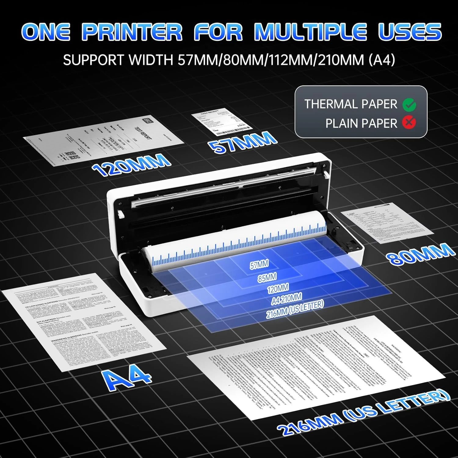 تدعم مقاسات ورق متعددة: A4 ، A6 ، 80 مم ، 57 مم، مما يجعلها مناسبة لمختلف الاحتياجات.